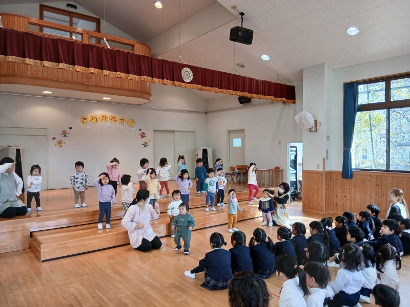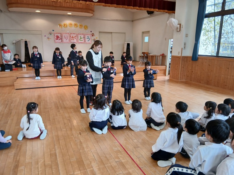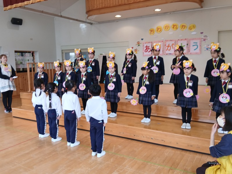 0・1・2歳児のしずく・ふたば・つぼみ組さん、年少児の虹組さん、年中児の月組さんが、もうすぐ卒園する星組さんにおわかれ会を開いてくれました(^-^)